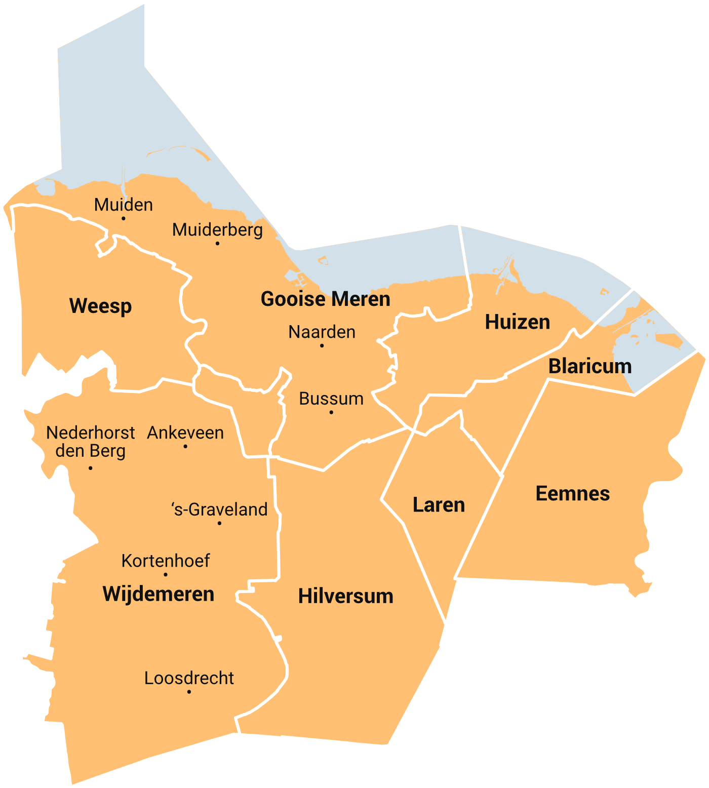 We zijn werkzaam in Hilversum, Loosdrecht, Kortenhoef, ‘s-Graveland, Ankeveen, Muiden, Muiderberg en Weesp, Naarden, Bussum, Blaricum, Eemnes, Laren en Huizen.